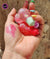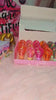 Appearance: The lip glosses are a vibrant pink/reddish color and contain glitter or small decorative elements, giving them a shimmery, glossy appearance.