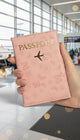 The image shows two passport holders, one pink and one black, designed to protect and store passports and other travel documents.